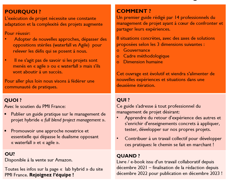 Après une première consolidation du document en Juin 2022 et le début de l'aventure "finalisation de la rédaction pour publication" en décembre 2022, le groupe de travail Lab Hybrid a pris un nouveau tournant avec le sponsoring du Chapitre PMI France et le lancement du projet de publication avec le support d’AMAZON.