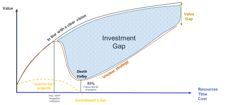 Ce schéma met en évidence les dangers associés à un manque de clarté ou de vision stratégique dans la gestion des projets AI et de son intégration technologique.