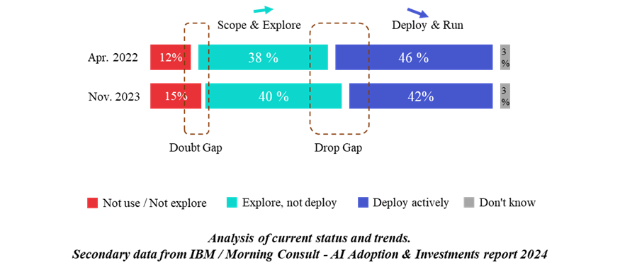 Une analyse comparative de l'évolution des projets d'intelligence artificielle entre 2022 et 2023, basée sur le rapport IBM de 2024, révèle une stratégie plus prudente ou une période de cadrage plus longue, où la planification et l’exploration sont priorisées avant de se lancer pleinement dans le déploiement ou la transition. Cet effet correspond à la lecture du marché également qui, malgré des investissements massifs, se caractérise par des échecs précoces et rapides de ces initiatives.