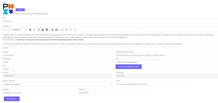 Les administrateurs Job Pro Pulse de PMI France crée le contact Entreprise à partir des informations fournies.