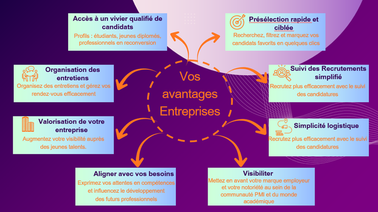 - Faciliter la mise en relation entre étudiants, écoles et entreprises grâce à la création d’une plateforme digitale dédiée à la gestion de projet.