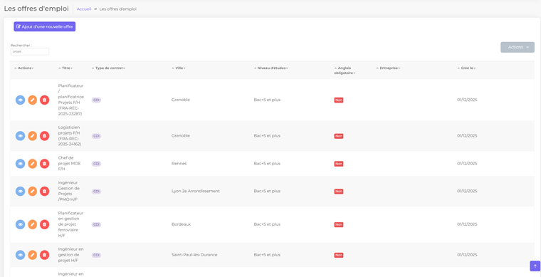 Les Administrateurs entreprises peuvent renseigner les offres d'emploi à proposer sur la plateforme. L'offre peut être créee directement sur la plateforme ou via un lien sur le site des offres entreprises.
